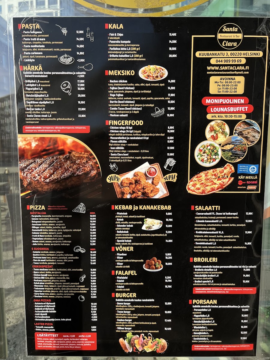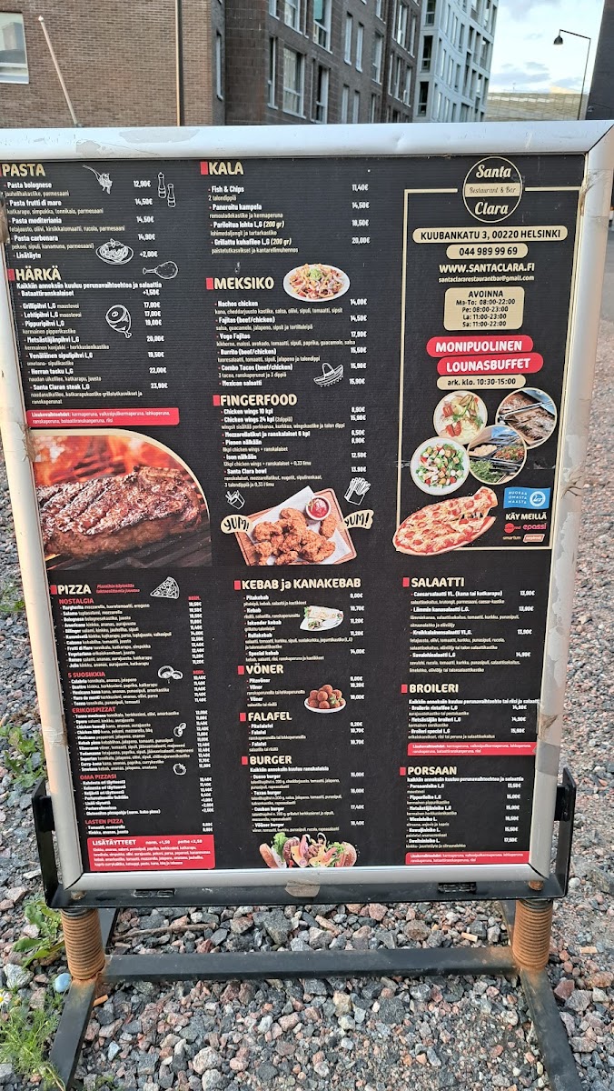 Nestled in the heart of Helsinki, Restaurant & Bar Santa Clara brings a vibrant dining experience with a menu bursting with flavor. Their renowned selection of pizzas stands out, featuring unique combinations like the Mexicana Kana with chicken, pineapple, and red onion, and the Quattro with ham and shrimp, each priced at €14.50. For those craving something fresh, the warm chicken salad and smoked salmon salad offer a delightful balance of textures and tastes, both under €19.
